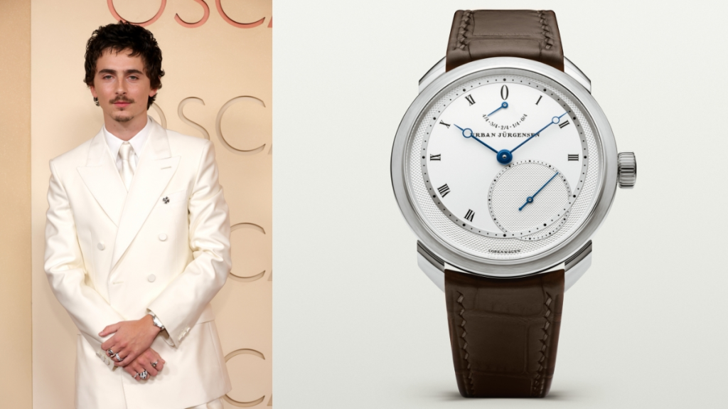 Actor Timothée Chalamet chose the Urban Jürgensen UJ-2, a rare masterpiece with a double-wheel escapement. It represents the peak of independent watchmaking.